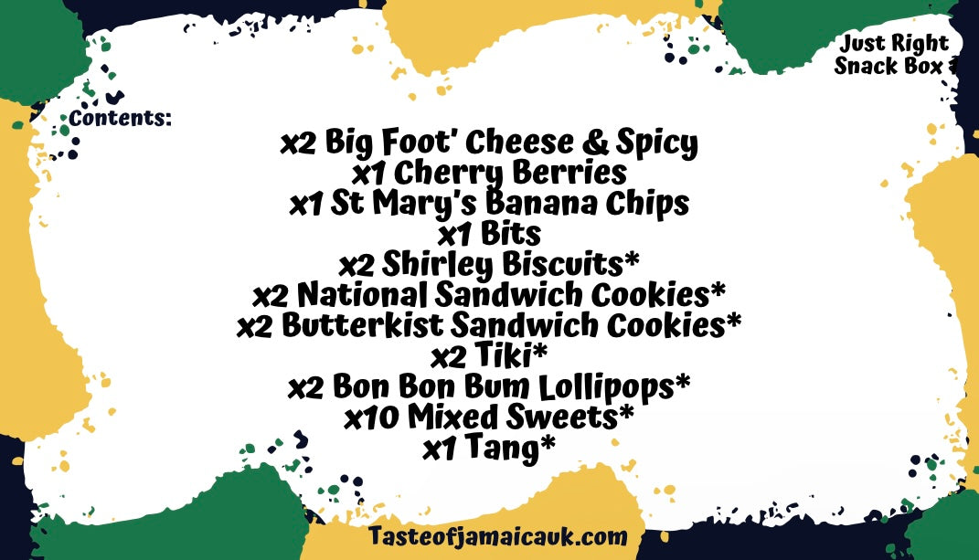 The Just Right Snack Box includes all items featured in the picture and listed below: